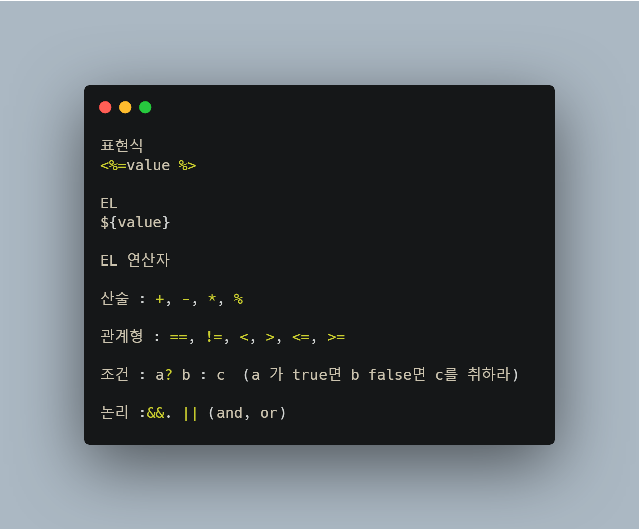 표현식 또는 액션 태그를 대신해서 값을 표현하는 언어.