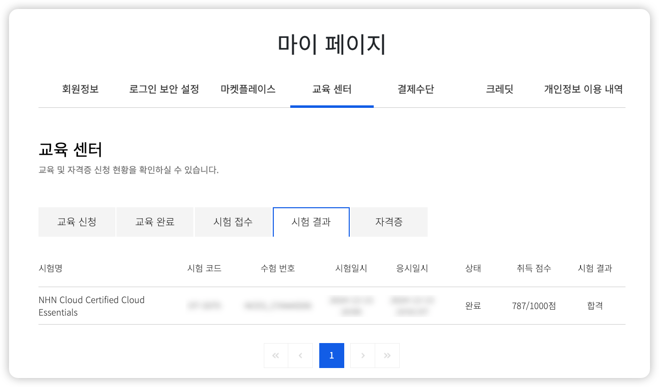 그리고 다음날 메일을 받은 뒤 NHN Cloud > 마이 페이지 > 교육센터 > 시험결과 를 통해 시험 합격 결과를 확인할 수 있었습니다.